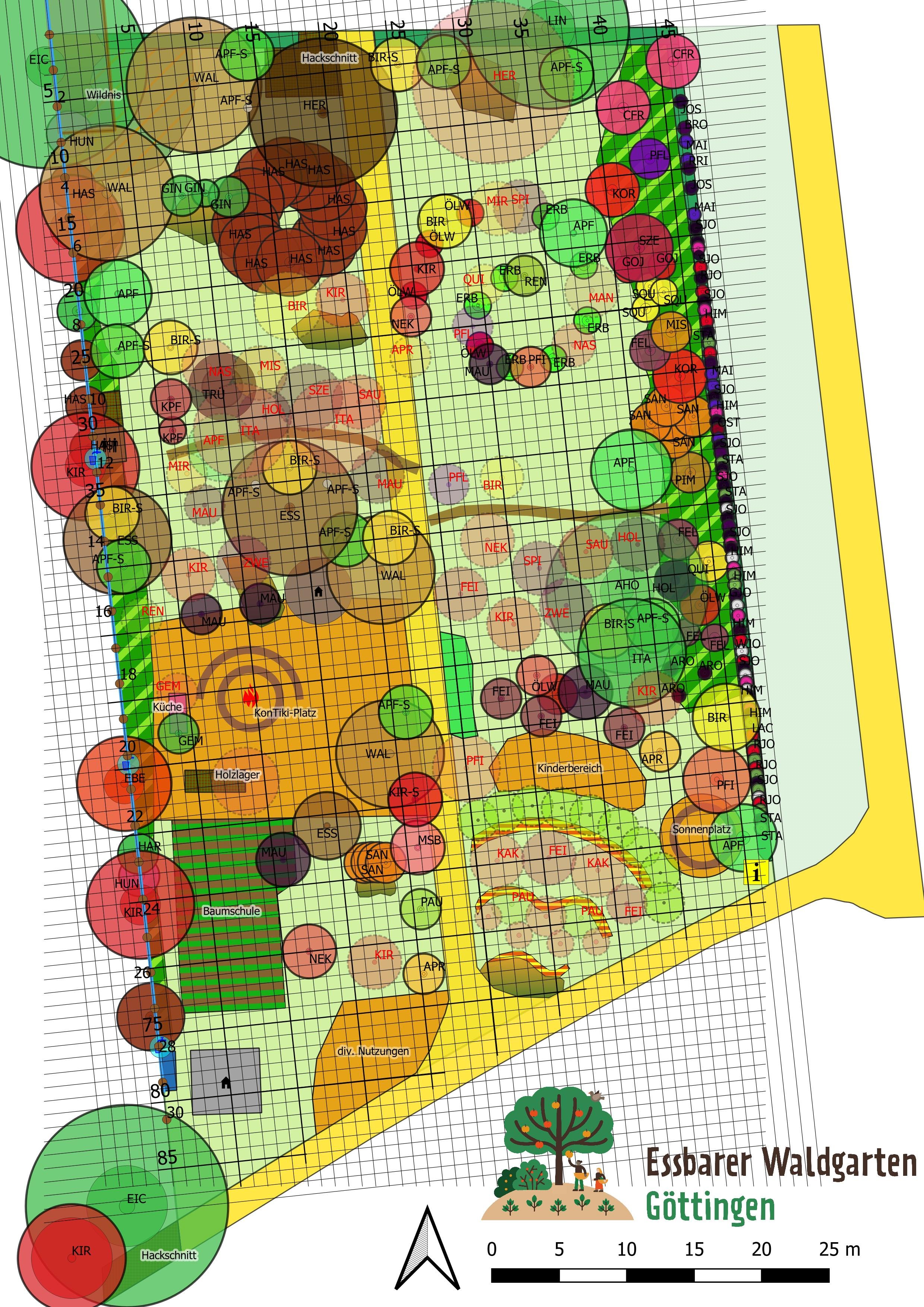 Hinter dem Swale soll ein Himbeerspalier auf dem Swale-Wall stehen. Im Swale sind feuchtigkeitsliebende Kräuter geplant. Über dem Schattenbereich sollen zwei italienische Erlen stehen, wobei wir noch nicht fest entschieden haben, ob es wirklich zwei werden, oder ob wir eine Erle durch einen anderen großen Nussbaum ersetzen. Italienische Erlen sind jene Stickstofffixierer, die in Waldgartensystemen in die oberste Baumschicht eingeplant werden und bis auf 10 m aufgeastet werden. Unter den Erlen soll in der unteren Baumschicht Hochstämme mit breiten Kronen stehen. Mispeln wären hier eine Option. Vielleicht auch Äpfel? Hier müssen wir noch weiter überlegen, insbesondere auch bezüglich der Erntezeit und dem Ernteverfahren. Damit der Schattenbereich möglichst feucht und kühl bleibt, haben wir über eine Hecke diskutiert, die den Bereich vor warmen Wind aus Süden schützt. Diese Hecke soll zwischen Esskastanie und Swale verlaufen. Hier gibt es unterschiedliche Lichtverhältnisse, weswegen wir einige Zeit über mögliche Pflanzenarten in dieser Hecke gegrübelt haben. Manche Pflanzen werden fast komplett im Schatten der Esskastanie stehen. Hier könnte z.B. eine Pflaumeneibe stehen. Andere Pflanzen werden noch recherchiert. Jeweils im Halbschatten der Esskastanie haben wir über Bambus, Pimpernuss und Linde nachgedacht. Noch weiter im Licht über Maulbeeren, Steinobst und Sauerkirschen. Die nördliche Seite soll durch eine Hecke aus Szechuanpfeffer, Holunder und anderen Sträuchern bestehen. Auch hier gab es noch keine fest Entscheidung.