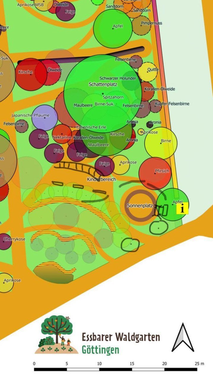 Auch der Kinderbereich wird sich eventuell etwas verschieben/verkleinern. Hierbei gab es die Idee, einen Barfußpfad im nördlichen Teil des Kinderplatzes, parallel zum Trockenbereich zu errichten und pädagogische Informationstafeln o.Ä. aufzustellen. Diese könnten ebenfalls als Windschutz für die wärmeliebenden Bäume dienen. Wechselnde Elemente wie Schild-Baum-Bank-Schild usw. könnten auf dem Durchgangs- und Barfußpfad für Schatten und gleichzeitig für einen Aufenthaltsbereich der Eltern dienen. Der Durchgangsweg zum Kontiki wird südlich neben dem Barfußpfad herlaufen, wodurch die Sichtschneise auch frei bleibt. Außerdem wird Windschutz gegen West/Ostwind für den Trockenbereich benötigt. Hier gab es den Vorschlag von Nadelbäumen wie Kiefer evtl. aufgeastet.