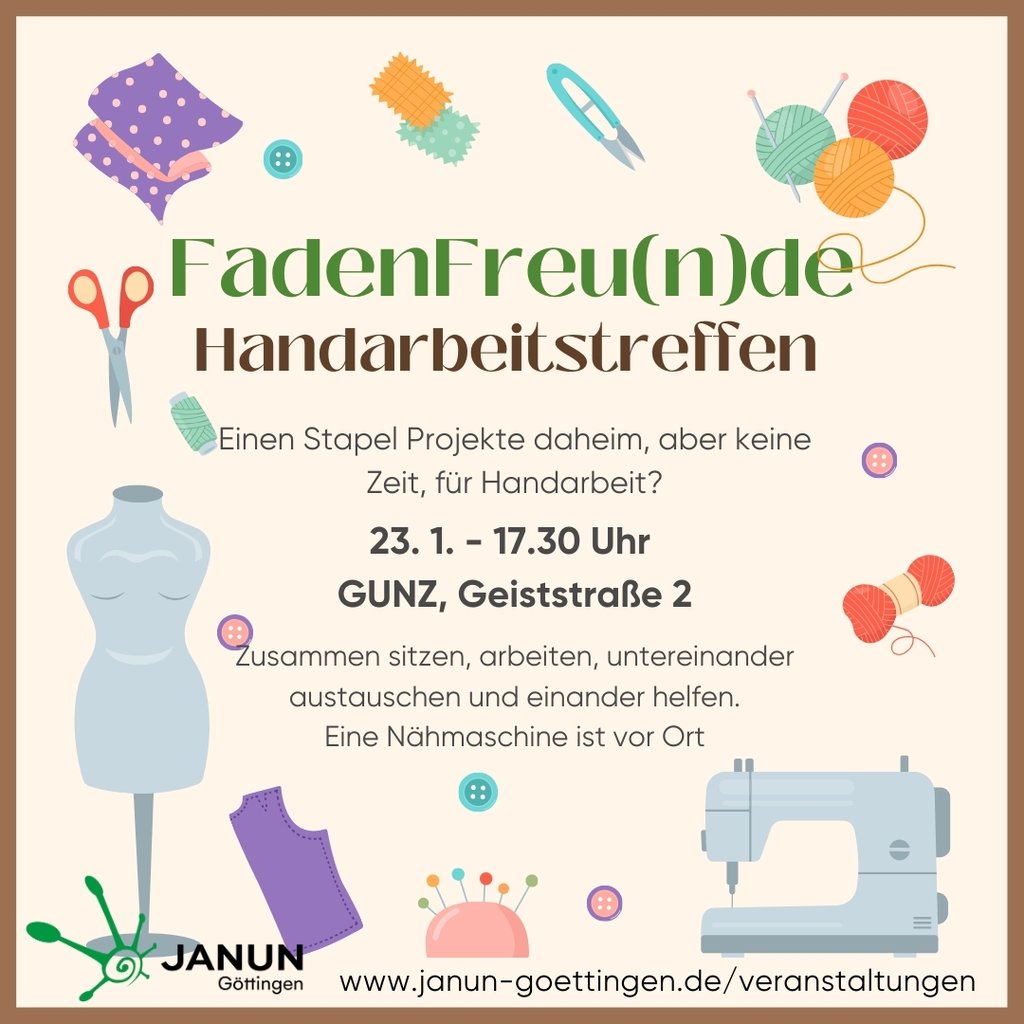 Dann kommt am 23. Januar ins GUNZ (Geiststr. 2) ab 17.30 Uhr, zu unserem nächsten Handarbeitstreffen! Wir haben ein paar Nähmaschinen vor Ort und Wissen in Klamotten nähen, reparieren (visible mending, Sashiko und Co.), stricken, häkeln und mehr. Egal, was ihr gerne macht, wir haben Raum für alle. :)