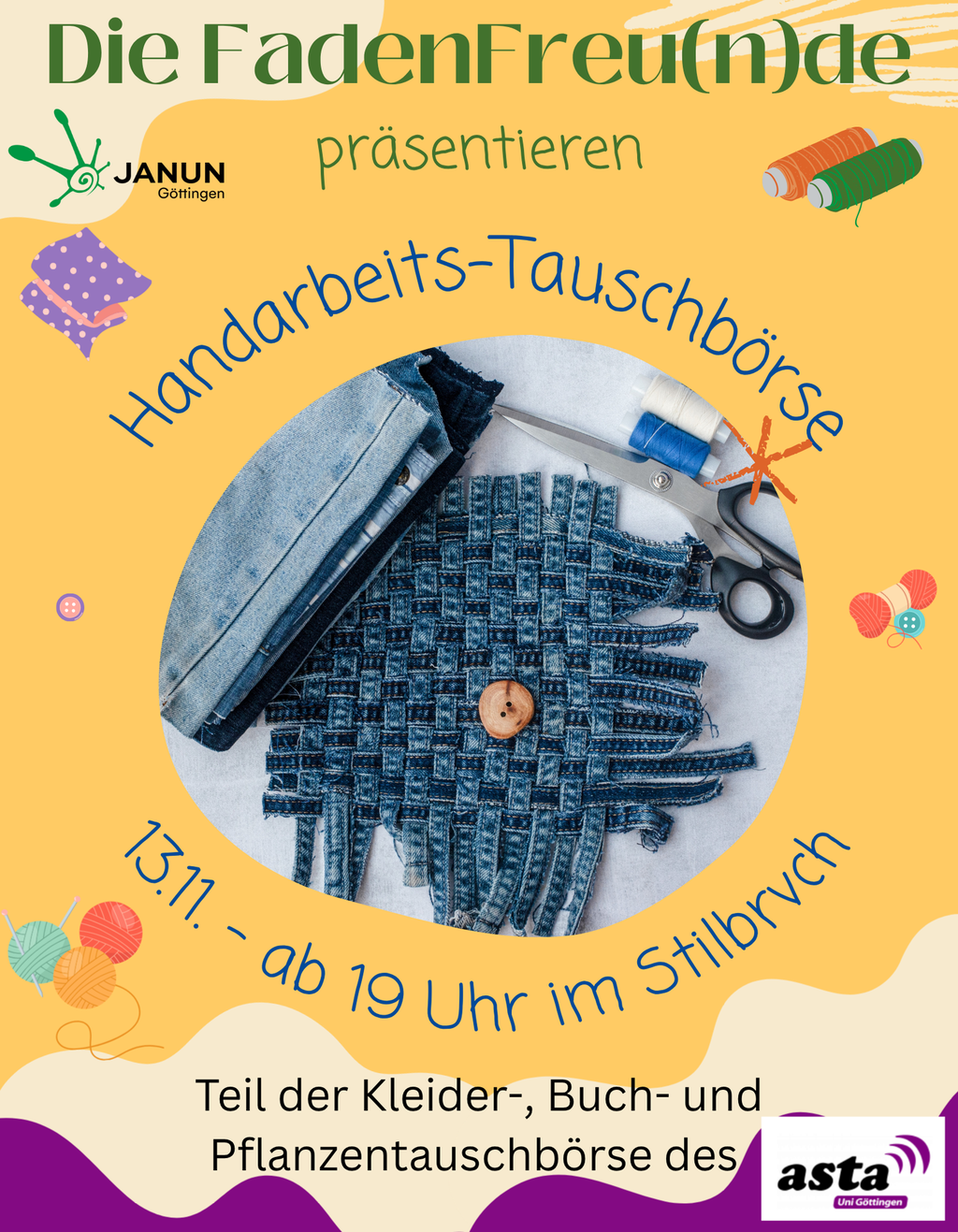 Auch in diesem Semester findet wieder die Kleider-, Bücher- und Pflanzentauchparty des AStAs statt! Dort könnt ihr Klamotten, Bücher oder Ableger mitbringen, die ihr nicht mehr braucht und gegen die Mitbringsel der anderen tauschen. Dieses Jahr könnt ihr auch Handarbeitsartikel wie Wolle, Stoff oder Stricknadeln mitbringen und tauschen. Wir, die JANUN Handarbeitsgruppe "Fadenfreu(n)de", werden vor Ort sein und helfen euch gerne bei der Reparatur/ Änderung von Klamotten.