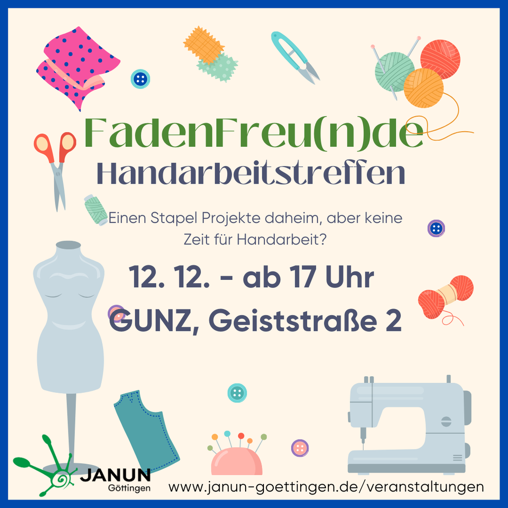 Dann kommt am 12. Dezember ins GUNZ (Geiststr. 2) ab 17 Uhr, zu unserem nächsten Handarbeitstreffen! Wir haben ein paar Nähmaschinen vor Ort und Wissen in Klamotten nähen, reparieren (visible mending, Sashiko und Co.), stricken, häkeln und mehr. Egal, was ihr gerne macht, wir haben Raum für alle. :)