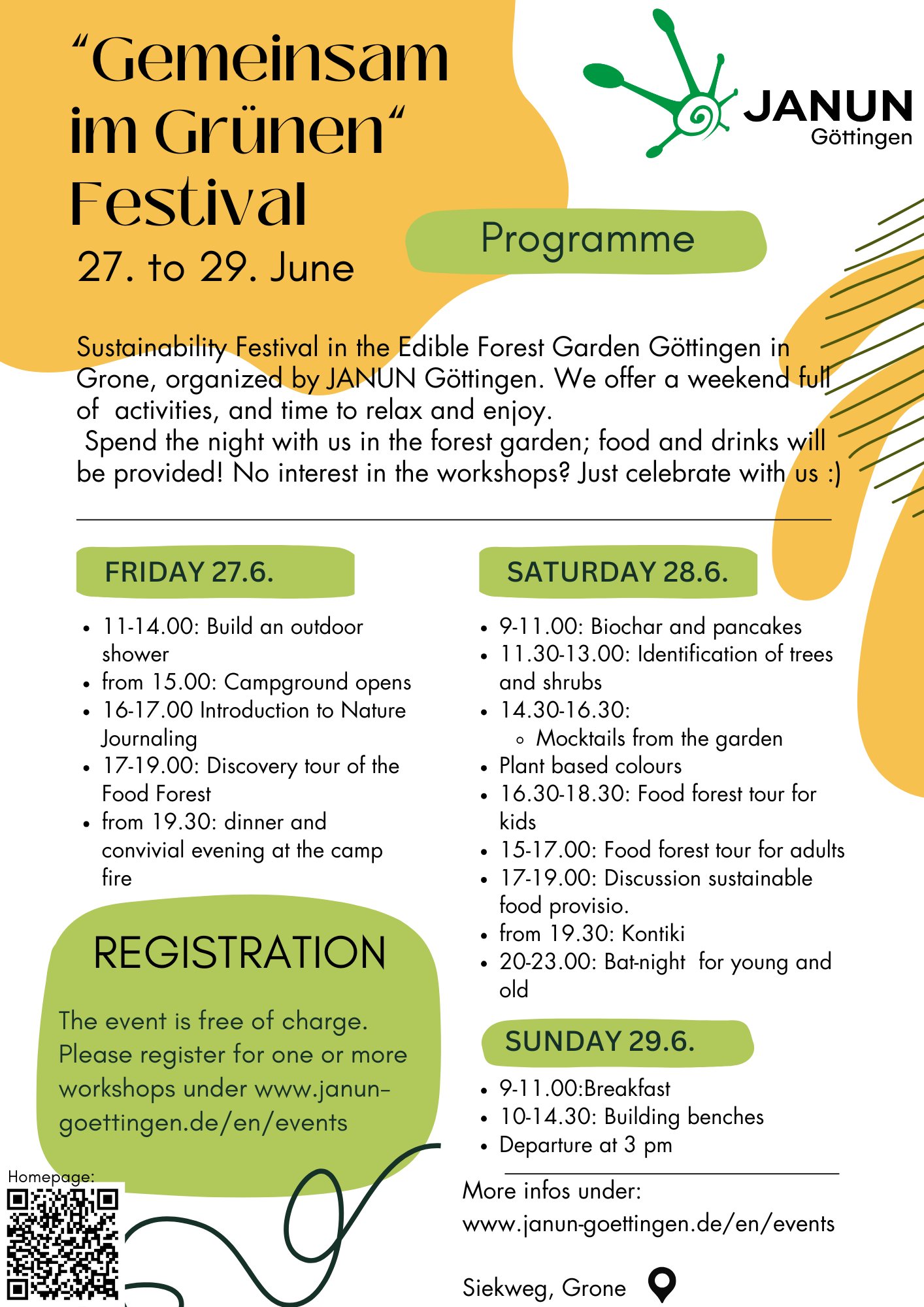 In the midst of our green oasis of the edible forest garden in Grone, we invite you to experience a weekend full of nature, communal exchange, and joy in sustainable living. From June 27 to 29, you can discover with us the diversity of our projects and the plant and animal inhabitants of the forest garden, participate in inspiring workshops, and gain new perspectives on sustainable coexistence. We want to do woodworking with you, observe nature and capture it artistically, pick and prepare our own food, and of course celebrate together. Enjoy unforgettable moments under the open sky and take the opportunity to stay right on the grounds in your own tent. You can join for any number of workshops or just come to celebrate.